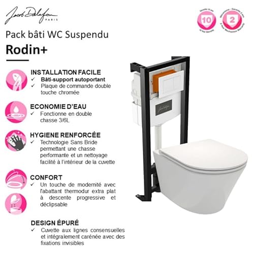 Pack WC Suspendu Rodin+ Blanc : Confort et Économie Un ensemble complet pour un WC moderne et fonctionnel. Avantages clés Abattant à descente progressive : évite les fermetures brusques et bruyantes pour un usage silencieux. Bâti support inclus : installation simplifiée...